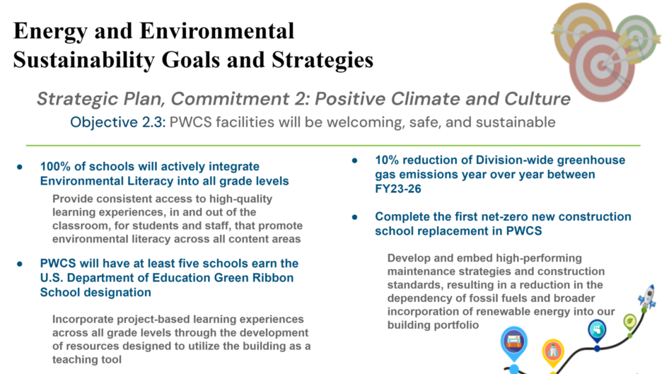 The story begins where it always should: with our students. From 2018-2020, students, driven by a desire to reduce our division’s carbon footprint, spoke passionately and repeatedly during school board public comment periods. Following those efforts, and through collaboration with our Energy and Sustainability staff, the School Board adopted a Sustainability Initiative for the division in June of 2020. This document directed the superintendent to “Create measurable standards of environmental literacy, to include a focus on sustainability for all K-12 students in PWCS [and] establish project-based learning opportunities with new efforts focused on sustainability and environmental literacy.”