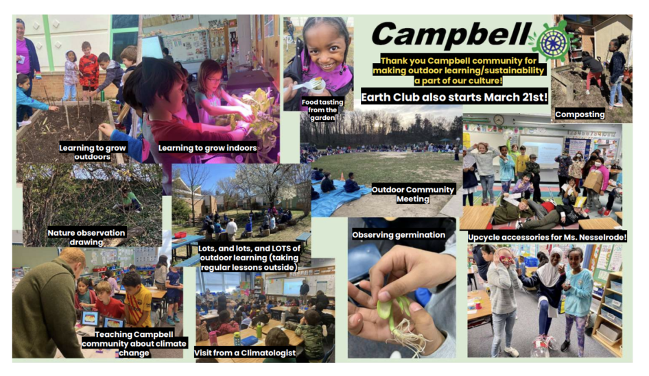 Each year, all of the Sustainability Liaisons curate a slide that showcases the work of their school. Each school’s slide is then compiled into a presentation to demonstrate the division-wide impact. This is then presented to the Sustainability Advisory Committee and the Superintendent at the spring annual meeting. This regular report keeps environmental literacy and sustainability as an expectation and imperative among both new and seasoned leadership.